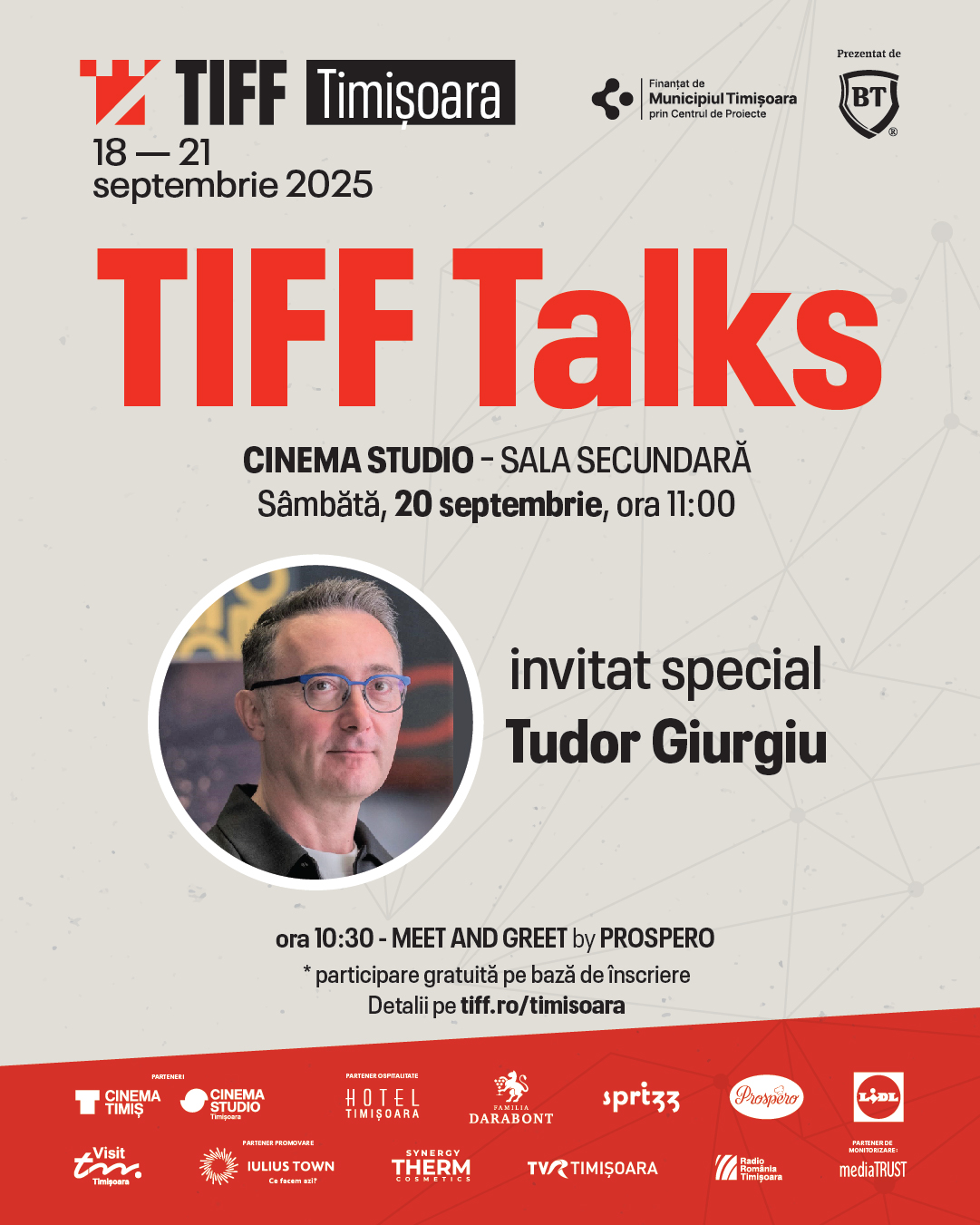 Regizorul Tudor Giurgiu va participa de asemenea la un TIFF Talk, sâmbătă, 20 septembrie, de la ora 11:00, la Cinema Studio. Accesul este liber, cu înscriere prealabilă online.