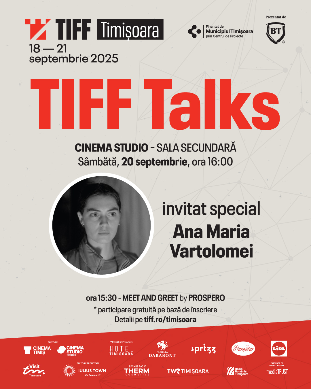 Anamaria Vartolomei va fi invitată și la un TIFF Talk, o discuție relaxată despre cariera ei. Evenimentul va avea loc la Cinema Studio, sâmbătă, 20 septembrie, de la ora 16:00. Accesul este liber, cu înscriere prealabilă online.