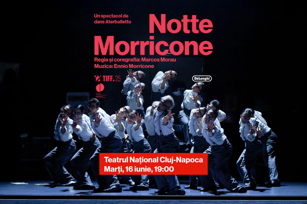 Construit ca o experiență coregrafică totală, Notte Morricone reunește 16 dansatori într-o producție care transpune pe scenă universul muzical al unuia dintre cei mai influenți compozitori din istoria cinematografiei. Muzica lui Ennio Morricone, reorchestrată și adaptată sub direcția muzicală a lui Maurizio Billi, devine punctul de plecare pentru o incursiune vizuală în memorie, imaginație și emoție colectivă. Spectacolul imaginează o noapte din viața unui creator, un spațiu al inspirației în care muzica prinde formă, iar amintirile și filmele renasc ca apariții scenice.
