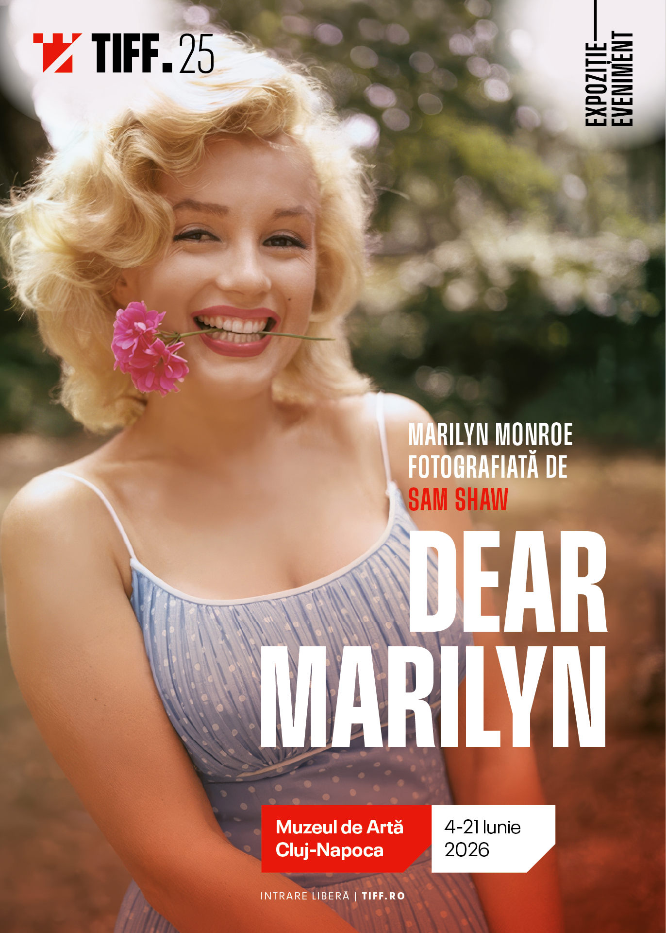 La 100 de ani de la nașterea actriței, fotografii inedite cu Marilyn Monroe realizate de Sam Shaw, celebrul fotograf american și unul dintre cei mai importanți martori vizuali ai Hollywood-ului anilor ’50, sunt subiectul unei expoziții unice la TIFF.25: Dear Marilyn. TIFF se alătură astfel unui lung șir de inițiative globale care dedică programe speciale centenarului Marilyn: Cinemateca Franceză, British Film Institute, National Portrait Gallery, MOMA sau Festivalul de Film de la Torino. Expoziția Dear Marilyn va putea fi vizitată la Muzeul de Artă Cluj-Napoca în perioada 4 – 21 iunie, iar intrarea va fi liberă.